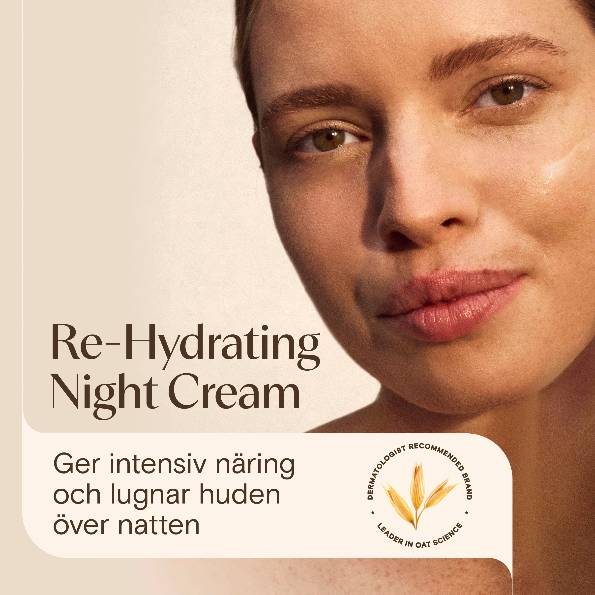 Re-Hydrating Night Cream innehåller sheasmör och mineralkomplex, känt för att öka omsättningen av hudceller på hudens yta* samt återfuktar din hud så att den ser hälsosam ut. Innehåller prebiotisk havre, känd för att hjälpa till att lugna och reparera huden genom att återställa hudens fuktbarriär, och med lugnande feverfew, känd för sin egenskap som antioxidant och för att hjälpa till att lugna huden.