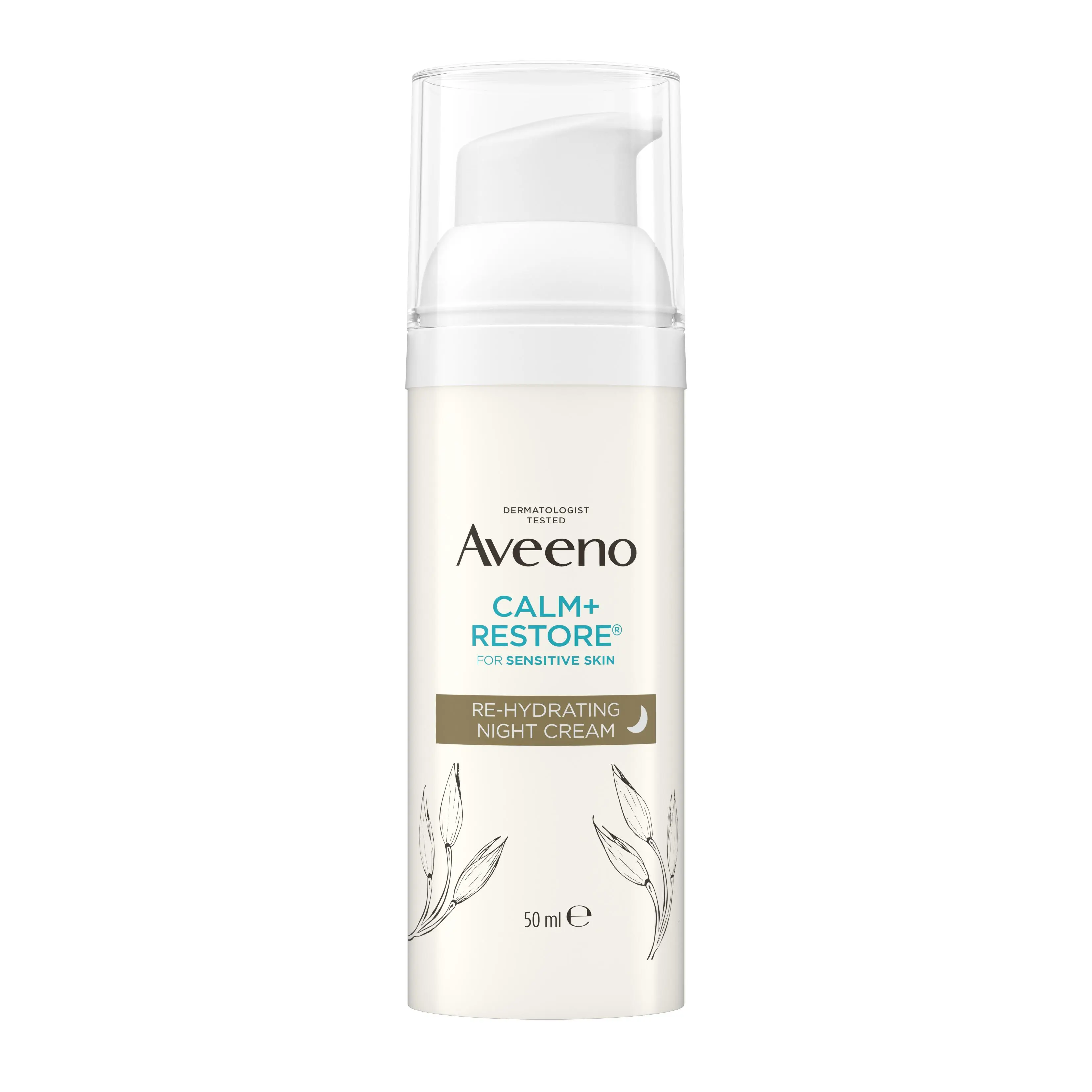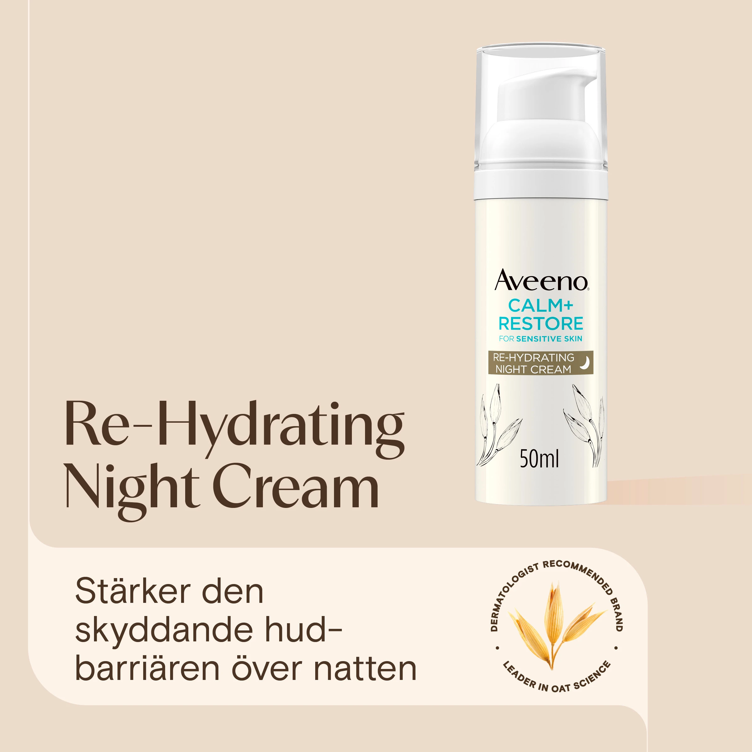Med näringsrik havre som stärker den skyddande hudbarriären över natten med Aveeno CALM+RESTORE® Re-Hydrating Night Cream. Formulerad för känslig hud. Återfuktar intensivt känslig hud, återställer och hjälper till att stärka hudens fuktbarriär när du sover, för lugnad hud på morgonen. Kladdfri, absorberas snabbt och den är kliniskt bevisad att ge näring åt känslig hud samt hjälper till att förhindra uttorkad hud nästa dag med 48 timmars återfuktning.